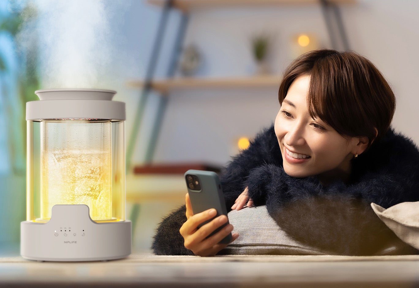 リラックス×潤い “光と香りで、空気が変わる。”アロマ対応スチーム式加湿器 NIPLIFE 「URURA(ウルラ)」(2025年11月4日発売)