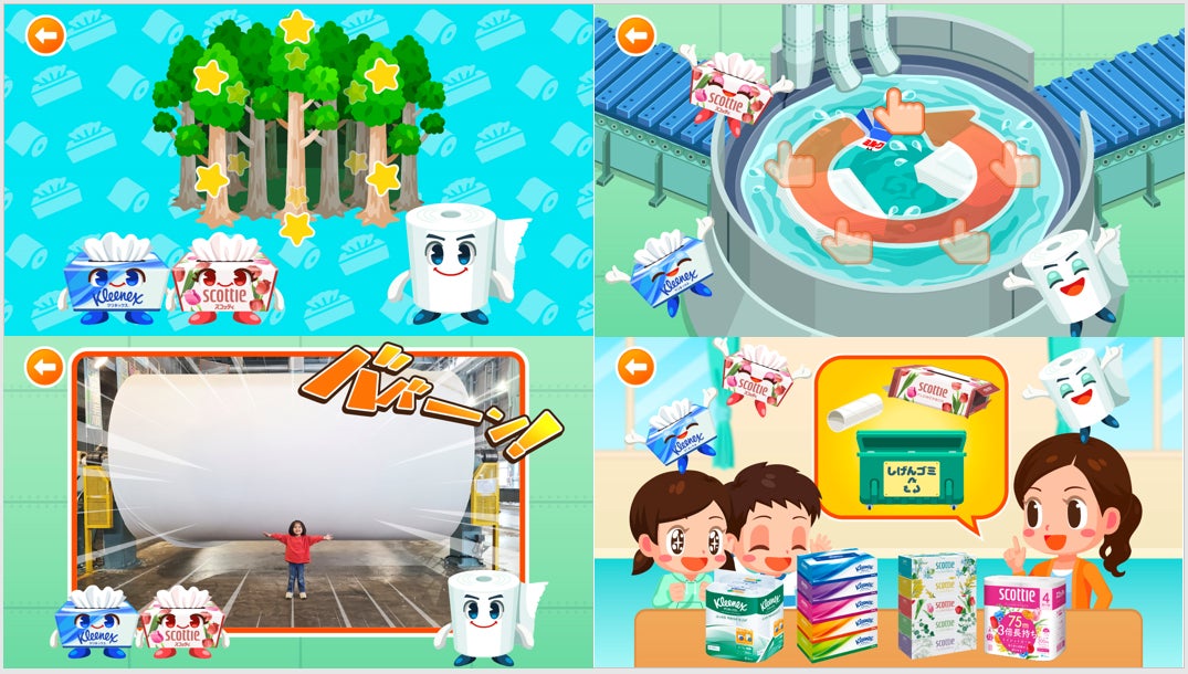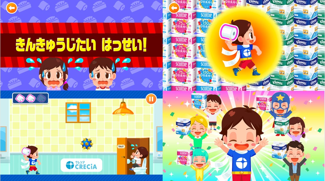 当社から発売している「クリネックス」と「スコッティ」のティシューペーパーとトイレットロールのキャラクターがゲーム内にナビゲート役で登場しティシューペーパーとトイレットロールの製造過程を楽しく紹介、また、トイレで紙がなくて困っている人にトイレットロールを届ける2つのゲームで構成されています。
