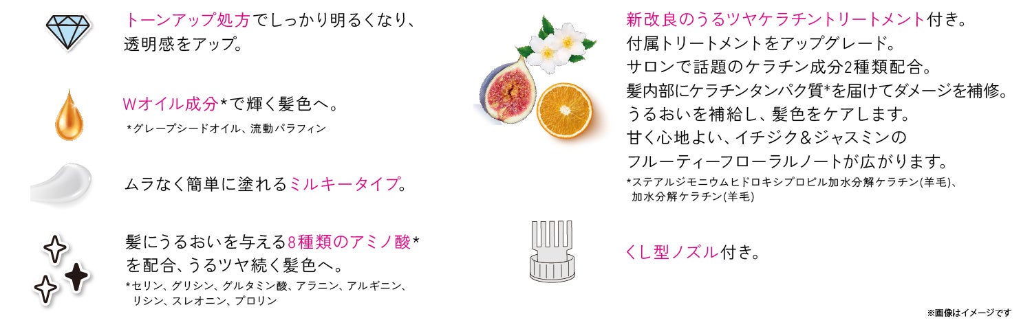 トーンアップ処方で黒髪でも高発色の明るいカラーに。Wオイル成分*で輝く髪色へ。8種類のアミノ酸**配合(うるおい成分)で、髪色ケア。新改良した付属のうるツヤケラチントリートメントで髪のダメージを補修します。全12色展開でなりたい髪色を叶えます。
