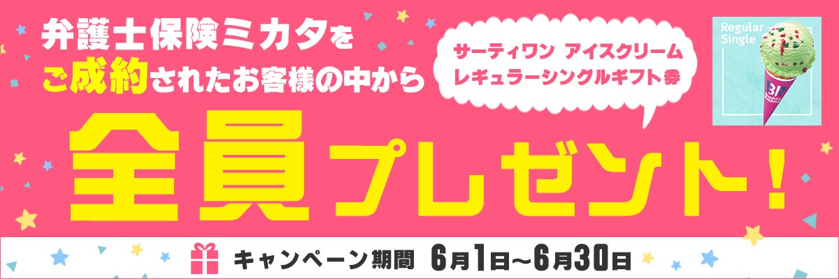 【弁護士保険比較】「弁護士保険ミカタ」ご成約で「サーティワン アイスクリーム レギュラーシングルギフト券」もれなくプレゼント【6月限定キャンペーン】