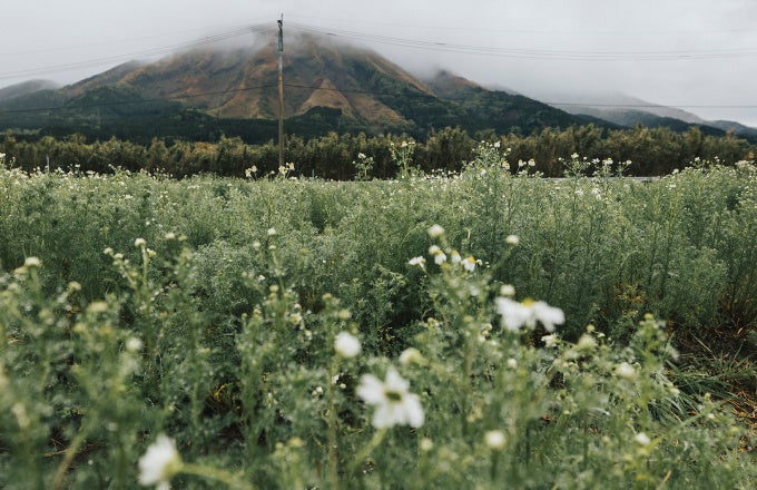 有用成分・アズレン類を逃さぬよう、ひとつひとつ手摘みで収穫したのち、24時間以内に水蒸気蒸留法で抽出。蒸留には阿蘇の湧水を使用しています。