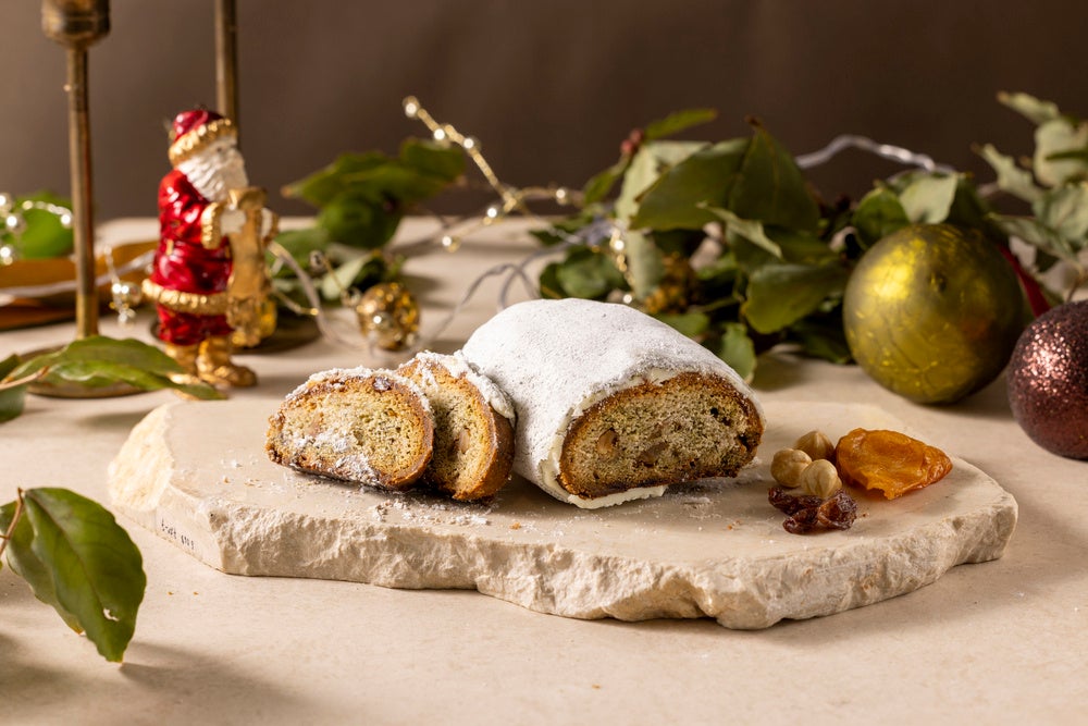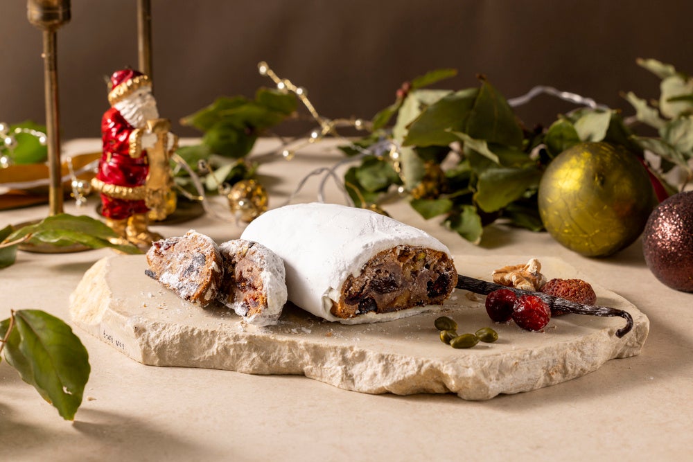 生地にはドライストロベリー、フリーズドライの苺フレーク、香りと色味で果実味が感じられる自家製の苺ジャムなど、主役となる苺をふんだんに使用しました。甘さの中に、酸味と風味を感じられる様、ブルーベリーとクランベリーも合わせています。そんな苺の甘みを引き締めるのが、ふんわり香るローズヒップティー。果実のつけ込みはもちろん、ミルで挽いたローズヒップの茶葉を粉糖と合わせシュトレン全体を包みました。ピスタチオやローストクルミの香ばしさと、アニスや有機シナモンなどスパイスとの調和を感じられるシュトレンに仕上げています。子供から大人までご家族でもお楽しみいただけます。