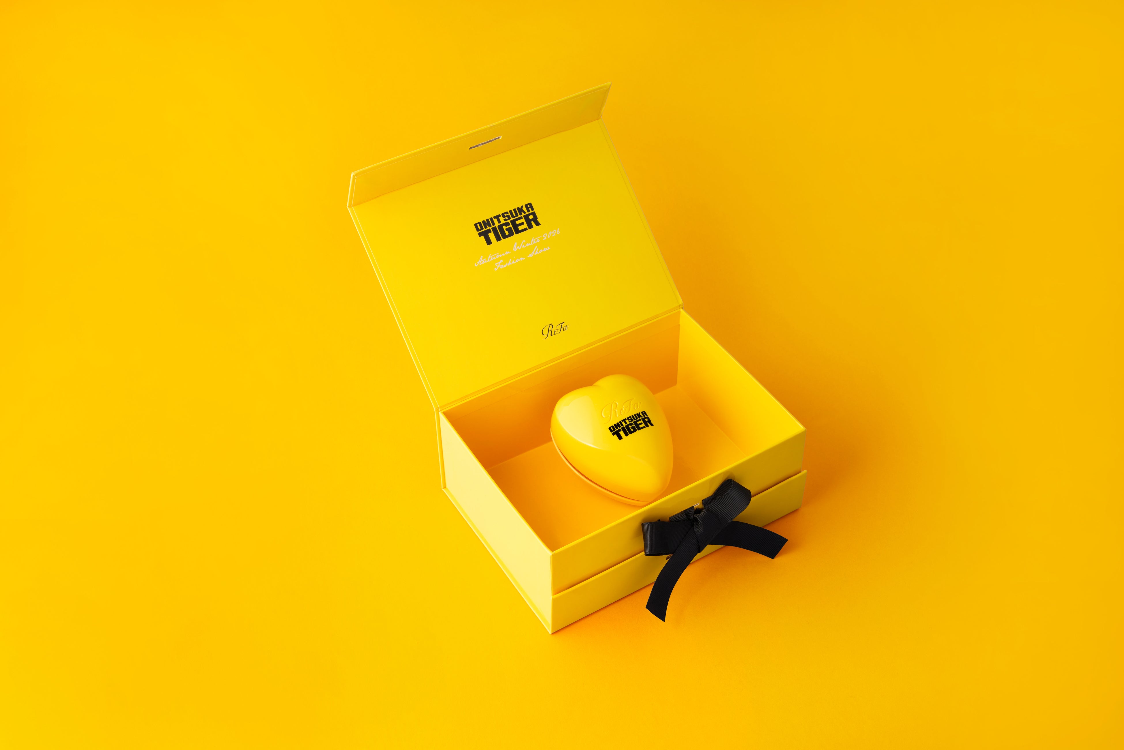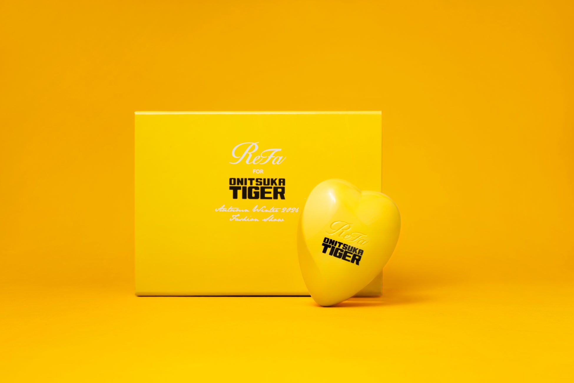 ショー会場には、オニツカタイガーイエローをまとったReFa HEART BRUSHが彩りを添えました。この特別なアイテムは、日本発の美容ブランド「ReFa」のアイコンモデルとして知られ、来場者にギフトとして贈られました。