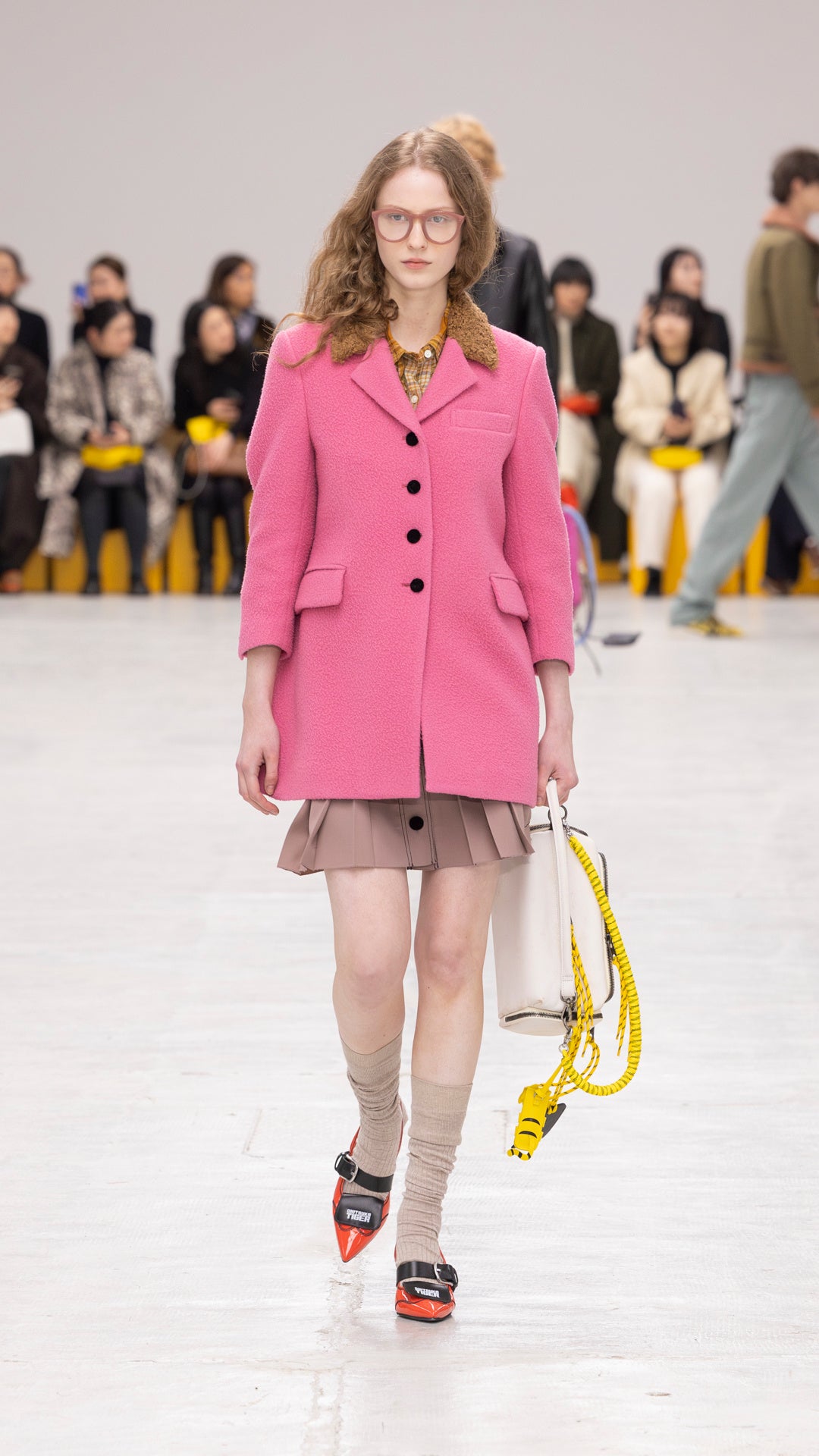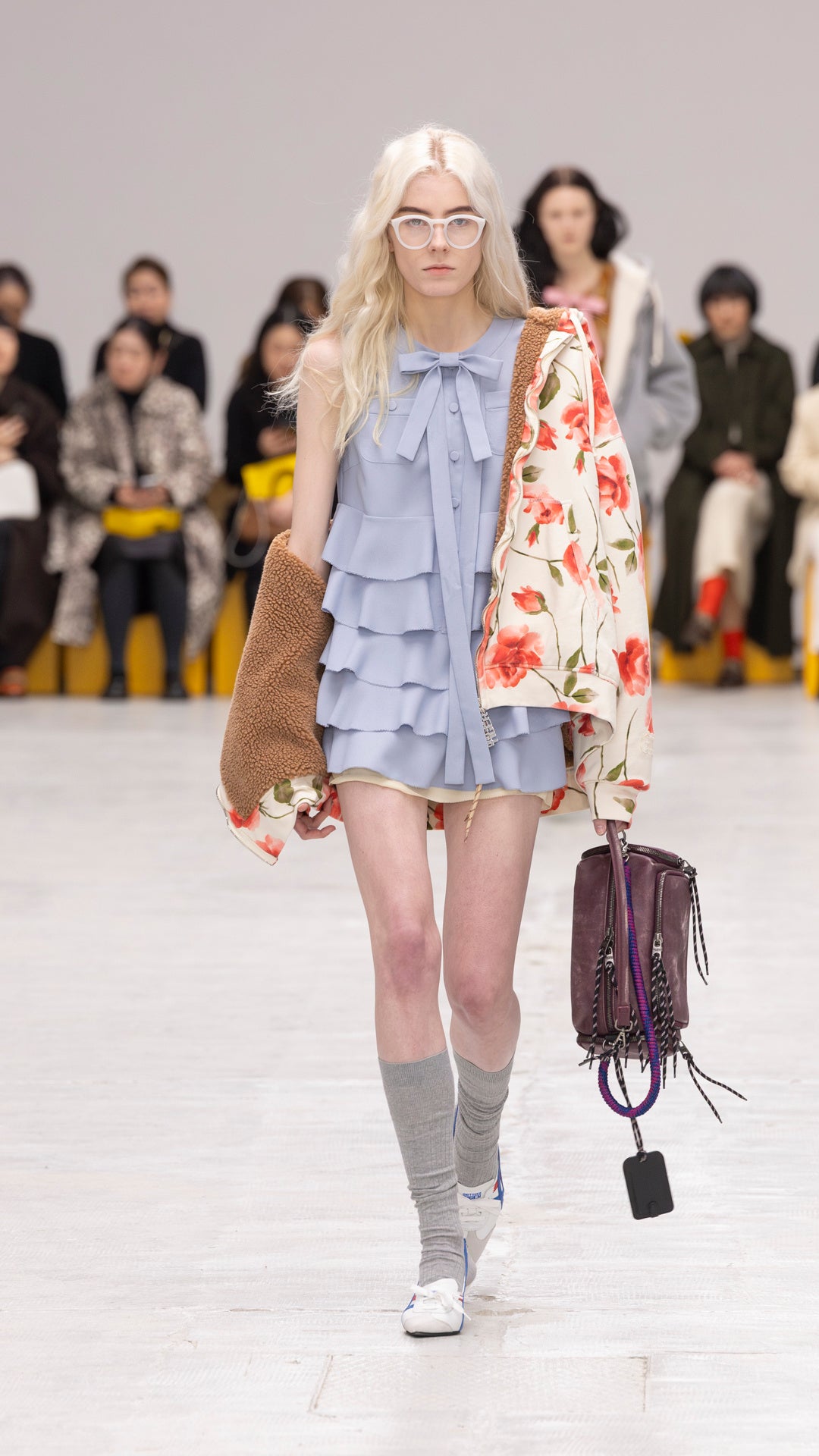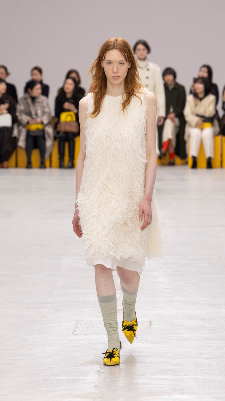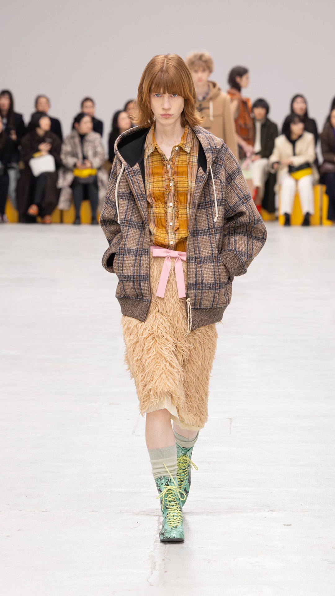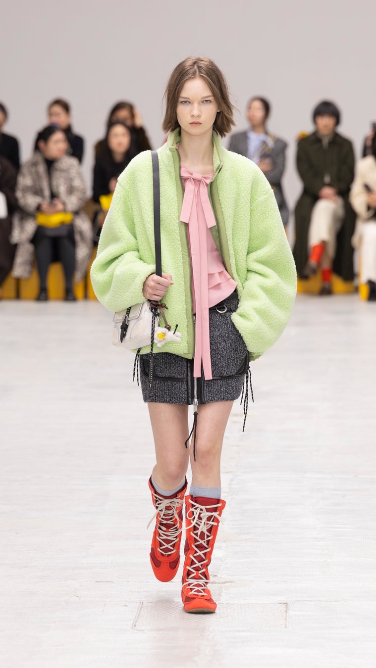 ランウェイでは、フォーマル・カジュアル・ワーク・スポーツのウエアが融合した、斬新な組み合わせのルックを発表しました。ボーダーにデザインされたドレスには、ヘリンボーンのオーバーサイズフーディーを合わせています。アップルグリーンのプリーツドレスは、コーデュロイにボアをボンディングした生地に大きなポケットが特徴的なコンパクトなショートベストを重ねています。また、軽やかなコットンにフローラルを差し込んだチェック柄ブラウスに、フェザーのように揺れる生地で仕立てたオークイエローのミディスカートと、ウエストにスカイブルーのリボンを合わせたルックや、アップルグリーンのフリースを主役に、首元にリボンがデザインされたキャディピンクのブラウスに、パッチポケットつきのニットのミニスカートを重ねたロマンティックなルックも登場しました。