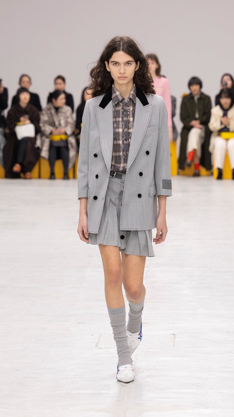 カジュアルな雰囲気のルックも、細部の精緻なテーラリングによって全体のバランスを整えています。襟とコントラストカラーのボタンを効かせたミリタリー風のロングダブルブレストコートとハイトップスニーカーを合わせたスタイリングや、フリルがデザインされたフローラルなチェック柄シャツに、オリーブグリーンで統一されたダブルブレストブレザーとショートプリーツスカートのセットアップを合わせたルックなどがその例です。