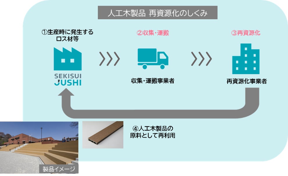 当社は、人工木製品の生産過程で発生するロス材を、再び人工木製品の原料として循環させる再利用技術を確立しており、本認定により、これまで廃棄されていたロス材の70%以上を再資源化し、製品原料として再活用できる見込みです。