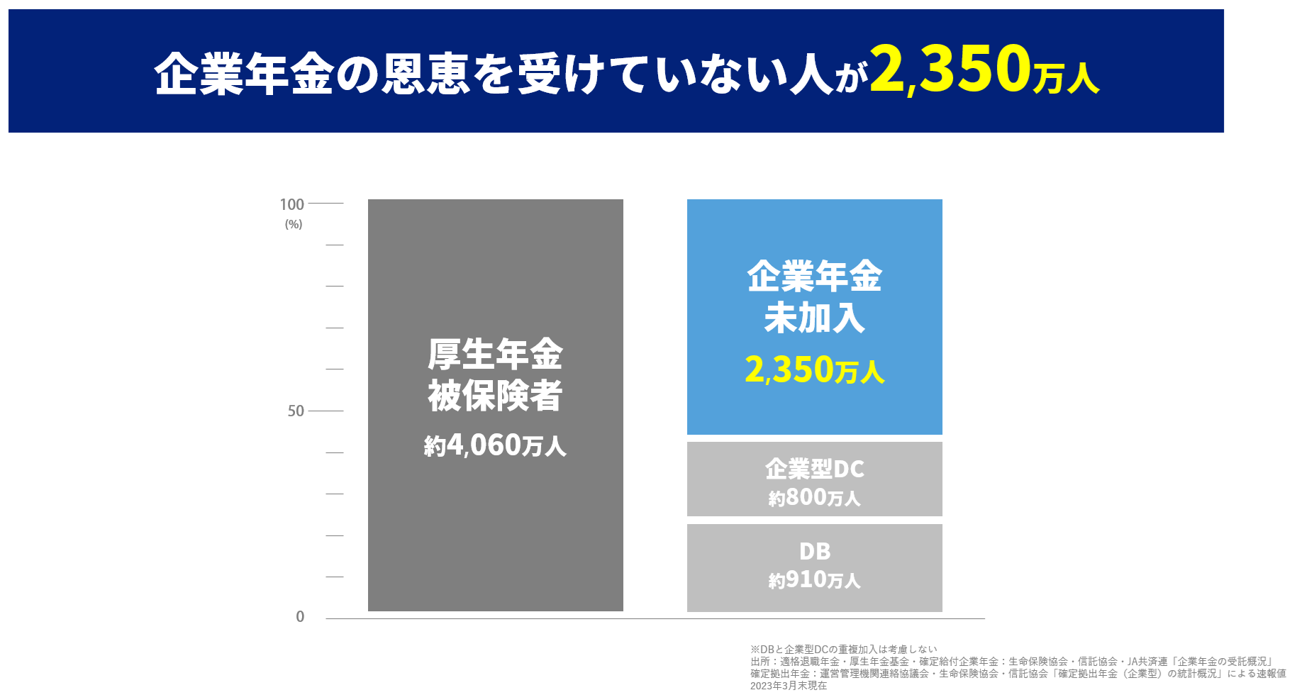 また、企業年金制度を利用できる厚生年金被保険者は約4,060万人であるのに対し、企業年金の未加入者は約2,350万人*³となっています。厚生年金被保険者の6割近くが、企業年金に加入できていないという実態があります。