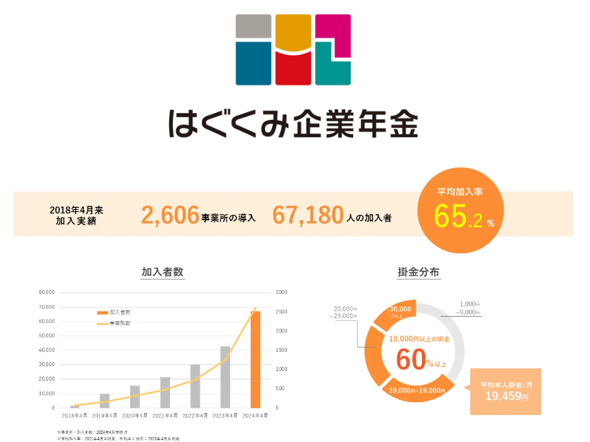 当社が実現したいビジョンにご賛同いただき、全国各地の地方銀行との提携も進んでおり、「はぐくみ企業年金」は基金設立後わずか6年で導入法人数2,263、加入事業所数2,606、加入者数67,180人(2024年4月末現在)と導入企業が急増しています。