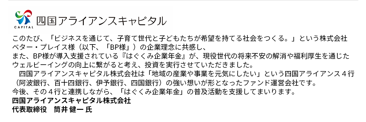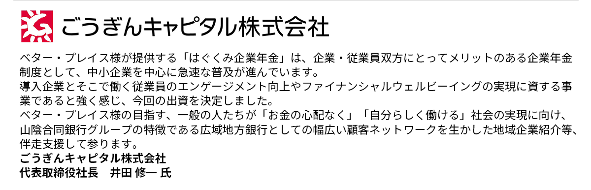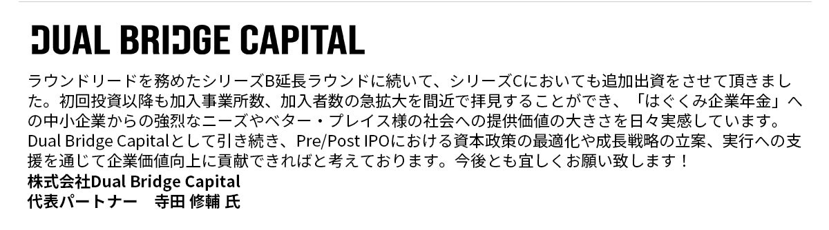 今回の資金調達により、ベンチャーキャピタルおよび地方銀行との提携強化を行うことで、全国の中小企業とそこで働く従業員の皆さまにあまねく企業年金および退職金制度を届けるべく邁進いたします。