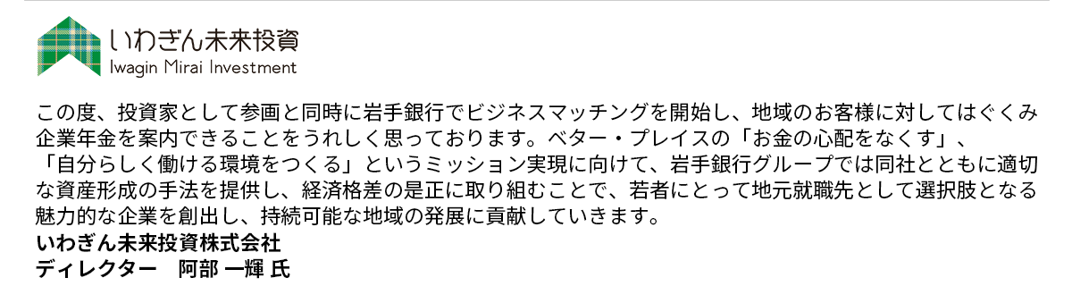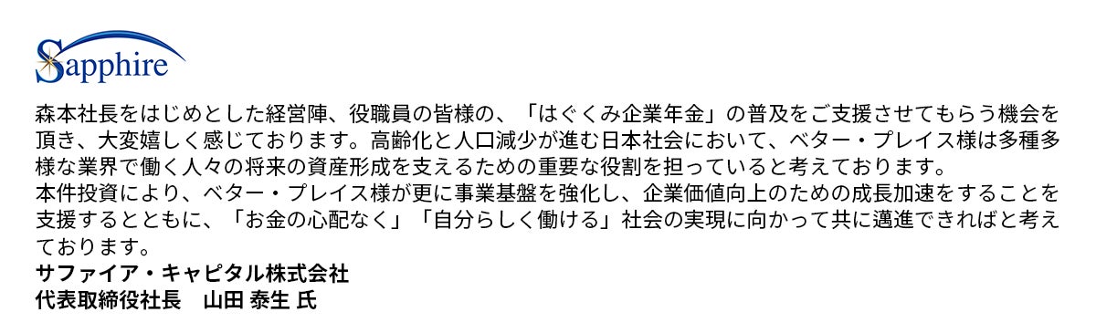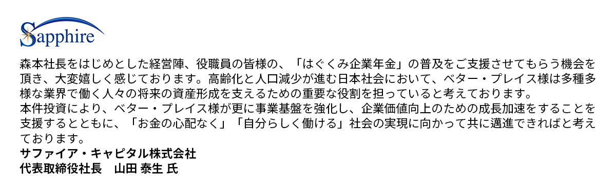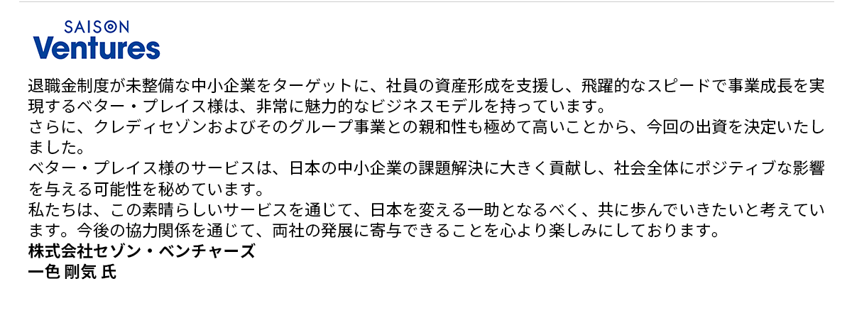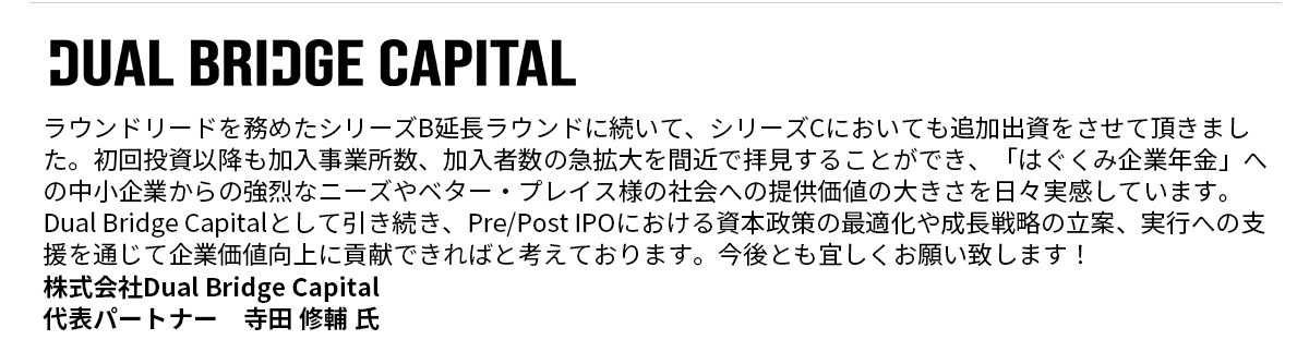 今回の資金調達は、「全国の中小企業の皆さまに企業年金制度を届けることによって、働く人の資産形成を後押ししたい」という当社の思いにベンチャーキャピタルの皆さまがご賛同いただいたことで実現いたしました。