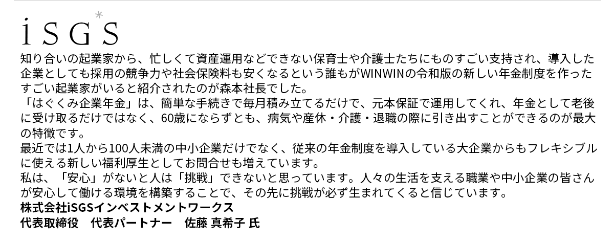 株式会社iSGSインベストメントワークス様の佐藤真希子代表は、日本のVC業界における数少ない女性代表です。我々が加入促進業務を受託している「はぐくみ企業年金」は加入者の2/3を女性が占めており、女性目線の運営は不可欠です。今後、単なる規模の追求だけでなく、企業年金サービスのダイバーシティ化を徹底して参ります。