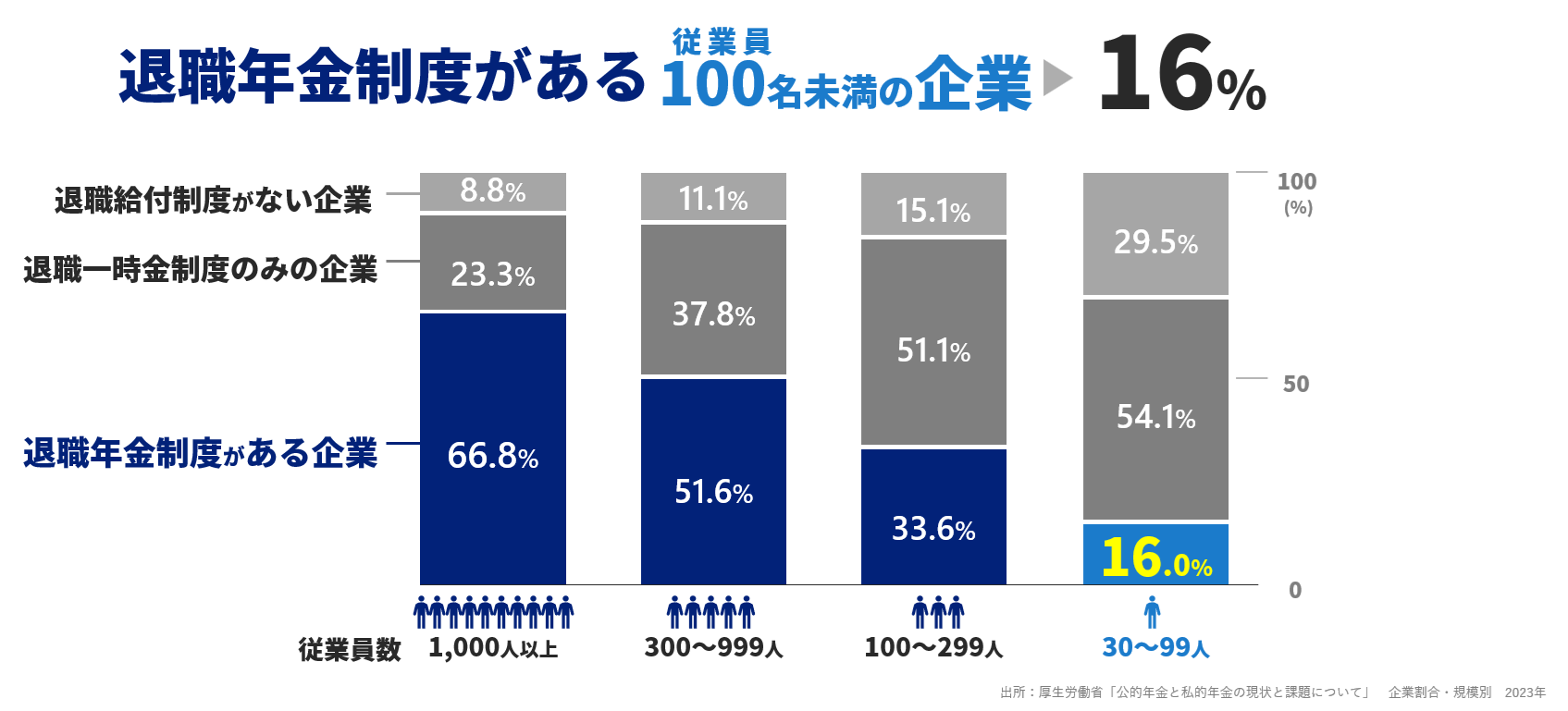 老後の資産形成に有効な手段の一つに「企業年金制度」があります。現在、日本にある企業は99%以上が中小企業*¹ですが、そのうち従業員100名未満の企業で企業年金が導入されているのはわずか16%*²にすぎません。