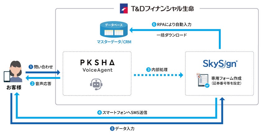 株式会社スカイコム(本社:東京都千代田区、代表取締役社長:川橋 郁夫、以下 スカイコム)は、T&D保険グループのT&Dフィナンシャル生命保険株式会社(代表取締役社長:森中 哉也、以下 T&Dフィナンシャル生命)、および株式会社PKSHA Technology(代表取締役:上野山 勝也、以下 PKSHA)との3社連携により、PKSHAが提供するAIボイスエージェント『PKSHA VoiceAgent』と、スカイコムの電子契約サービス『SkySign®』(スカイサイン)を連携させた、請求手続きの全工程デジタル化に向けた取り組みを開始いたしました。