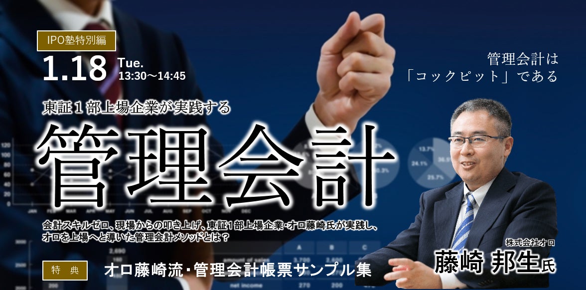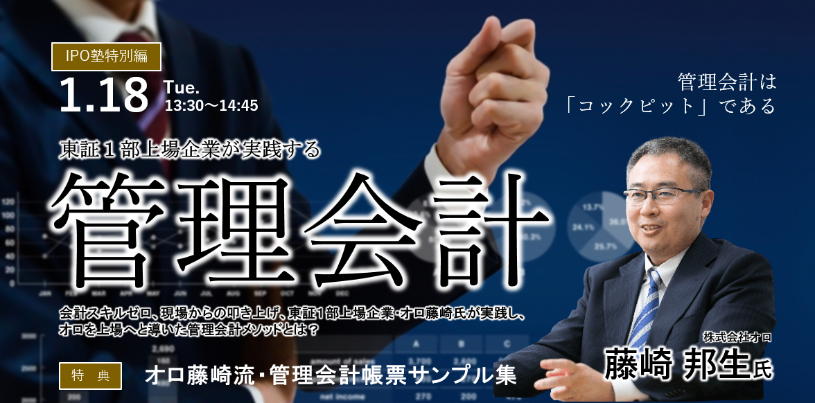 クラウドERP「ZAC」を提供する株式会社オロ(本社:東京都目黒区、代表取締役社⻑:川田 篤、以下「オロ」)は、2022年1月18日(火)に、IPO Forumネットワークが主催する「IPO塾」のセミナーに登壇いたします。2017年にIPOを実現し、現在も「ガラス張りの経営」を目指して精度の高い管理会計を追求しているオロの常務取締役・藤崎氏が講師として登壇し、管理会計で「安定的成長」を実現するための具体的実践例をご紹介します。