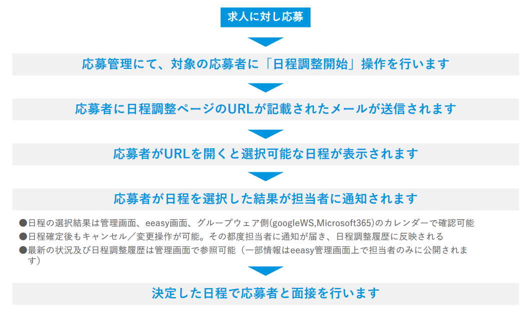 この度追加した機能は、求人応募者にWEBでの日程調整機能を提供し、採用担当者の対応工数の削減と面接実施率を上げることで、人材採用の成功率を高めます。