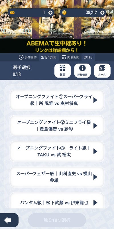 結果予想では、各対戦カードの勝敗や引き分けだけでなく、「KO・TKO勝ち」「判定勝ち」など勝敗の決まり方まで予想できます。予想成績上位の方にはサイン入りグッズやペアチケット等がプレゼントされます。