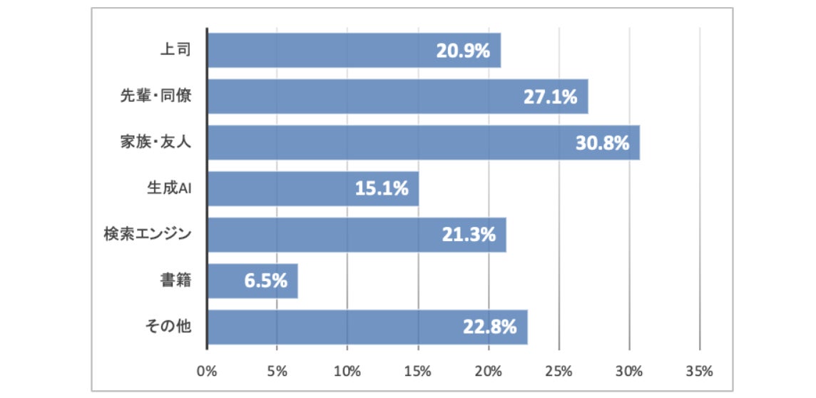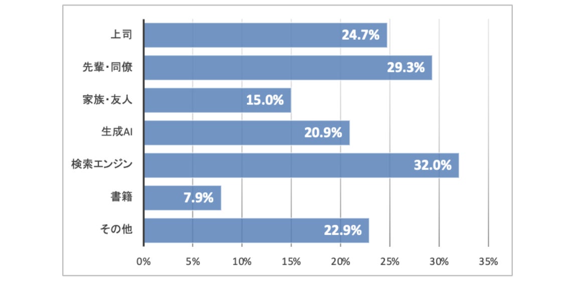 生成AIは協働者に?生成AIの利用領域が変化: 仕事で知識や情報不足に直面した際に「最初に頼るもの」として、「生成AI」(21%)が「上司」(25%)に迫る水準に。また、AIの利用領域は、定型業務(20%)だけでなく、専門的な問題解決(19%)やアイデア出し(13%)といった高度な業務にも拡大。