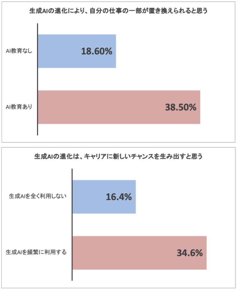 生成AIを利用することで将来への期待感が向上: 生成AI利用者の35%は「生成AIの進化が将来のキャリアに新たなチャンスを生み出す」と期待しており、未利用者の約2倍。一方、「生成AIについての教育」は、かえって不安を20ポイント増幅させているという結果となり、AIへの意識の変革には、形式的な情報提供だけでなく、実際の利用を促すような工夫が有効となりうると考えられる。(クロス集計)