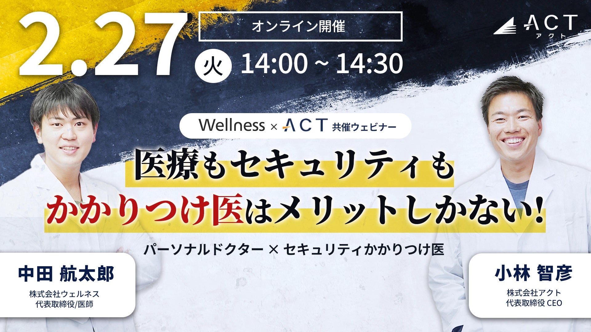 サイバーセキュリティ事業などを行う株式会社アクト(本社:東京都文京区、代表取締役CEO 小林 智彦 、以下 アクト)は、2024年2月27日(火)14時から『医療もセキュリティもかかりつけ医はメリットしかない!|Wellness×アクト共催ウェビナーを開催いたします。