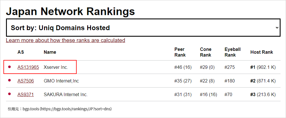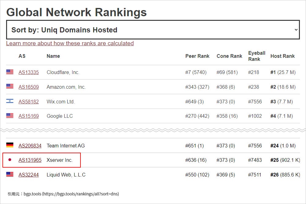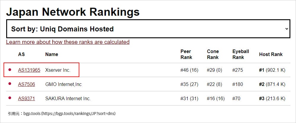 これらレンタルサーバーのバックボーンネットワークが、⽇本最⼤のサイト数の通信に使⽤されていることから、bgp.toolsが提供する「ホストされたドメイン数」ランキングにおいて、⼤⼿各社を抑えて国内通信事業者1位となりました。