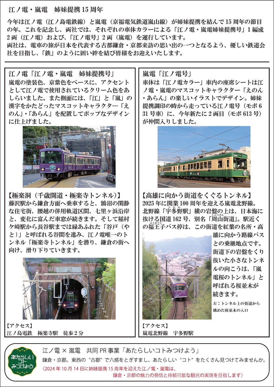 江ノ島電鉄株式会社(本社:神奈川県藤沢市、社長:黒田聡)と京福電気鉄道株式会社(本社:京都市中京区、社長:大塚憲郎)は、2009年の「江ノ電・嵐電姉妹提携」が15周年を迎える本年、東西の古都である鎌倉と京都の観光施設等を1枚のポスター、チラシで紹介し、新しい“こと”を見つけていく共同PR事業「あたらしいコトみつけよう」を実施しています。
