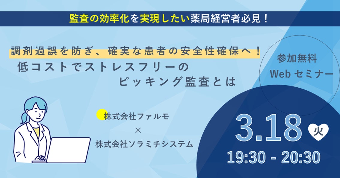 【ソラミチシステム:無料オンラインセミナー3月18日開催】好評により追加開催!「調剤過誤を防ぎ、確実な患者の安全性確保へ!低コストでストレスフリーのピッキング監査とは」