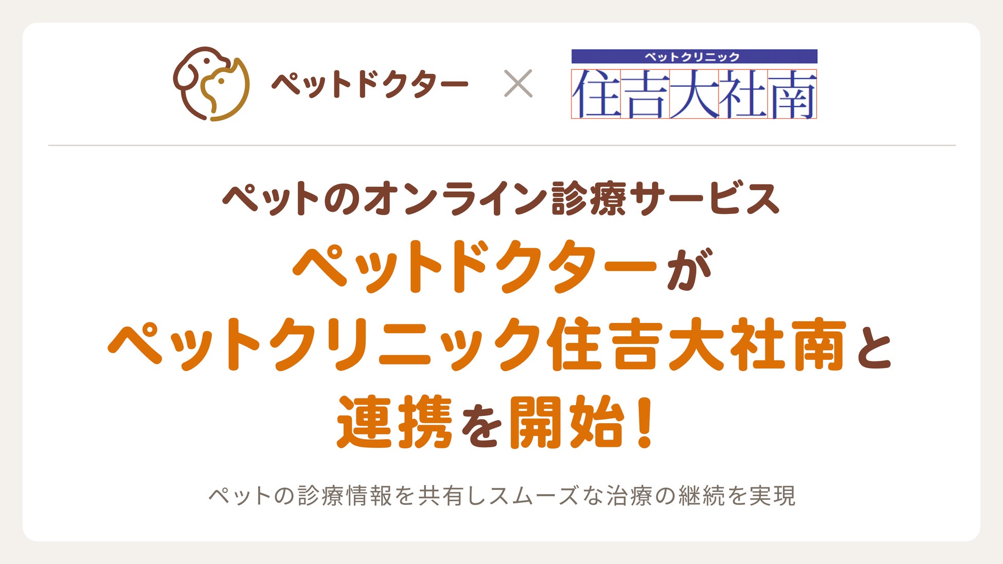 そこでこの度、大阪府にある動物病院「ペットクリニック住吉大社南」と情報連携を開始いたしました。ペットクリニック住吉大社南を受診している犬・猫がペットドクターを利用した際、必要に応じてペットドクターからペットクリニック住吉大社南にスムーズに診療情報を連携する取り組みを開始します。