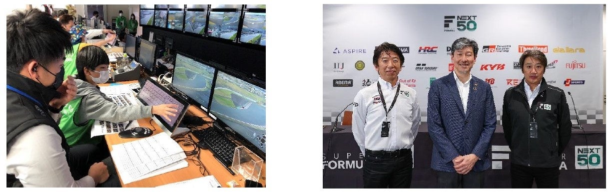 左:レースディレクターの仕事を体験するこども / 右:記者会見でのフォトセッション
