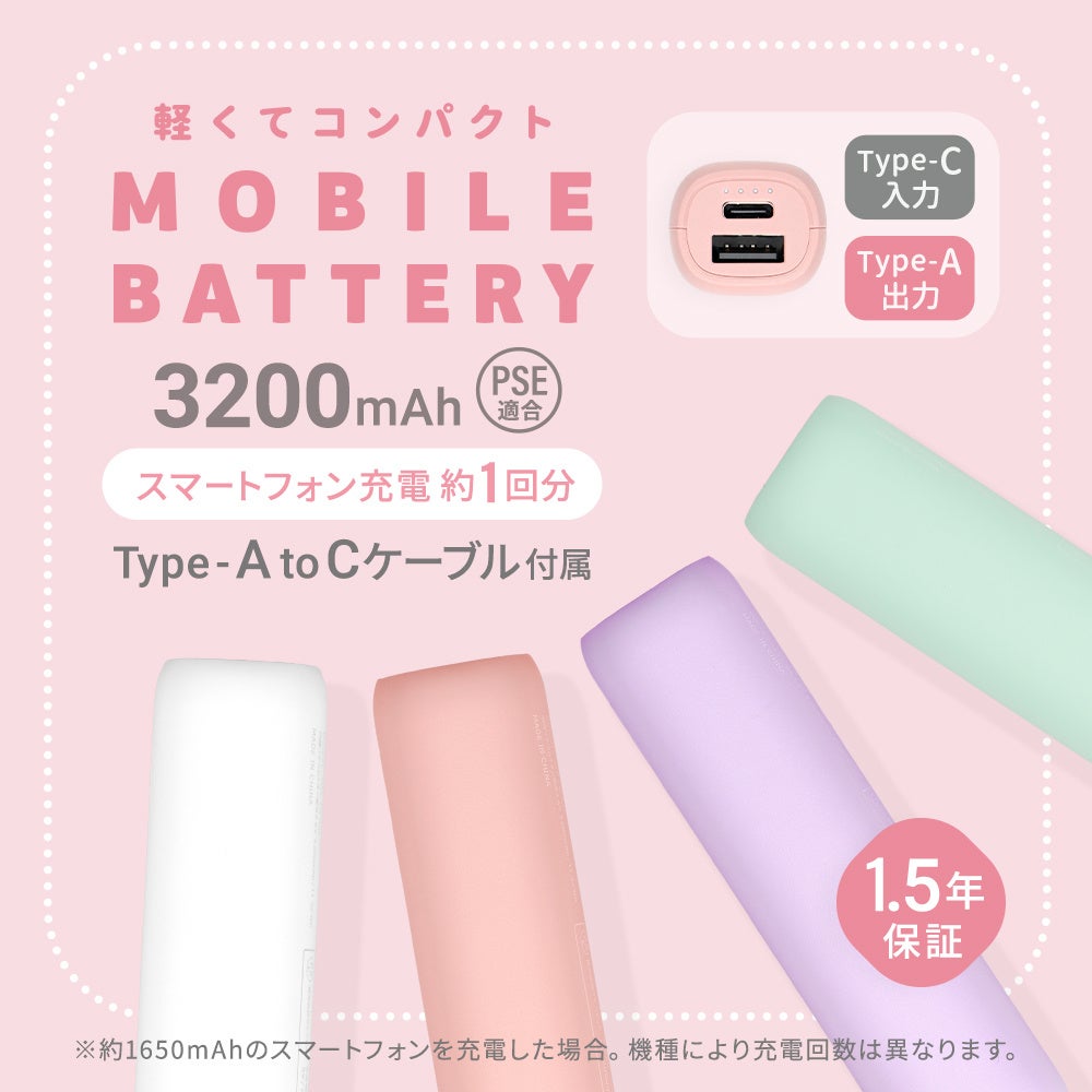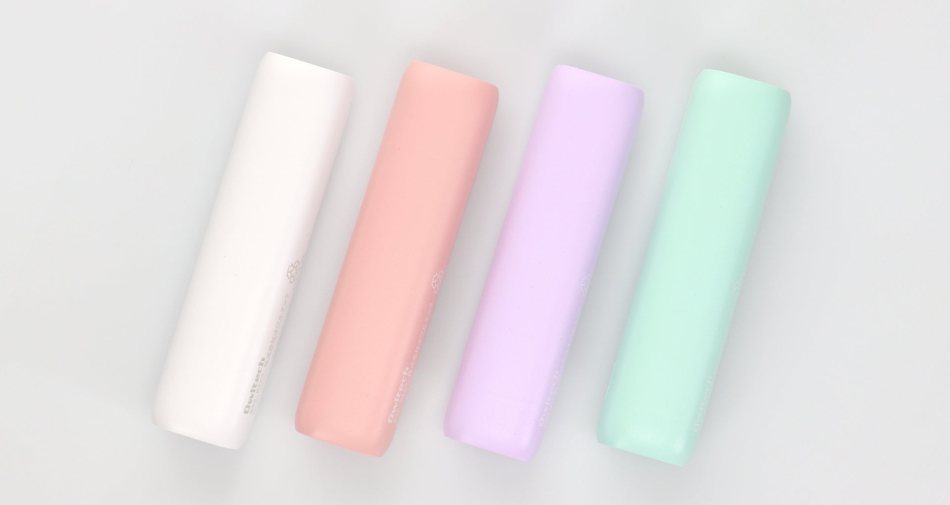 本製品は、手のひらサイズで軽量のコンパクトなスティックタイプのモバイルバッテリーです。容量3,200mAhで、スマートフォンを約1回分満充電できます。ポーチやバッグの中に収納しやすく、持ち運びもスマート。これからの季節にもマッチした爽やかなパステルカラーが特徴です。カラーはライトピンク、ミントブルー、パープル、ホワイトの4色をご用意しました。