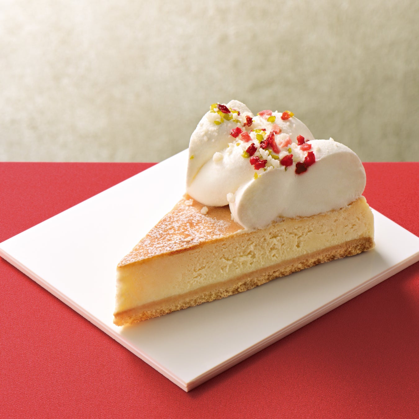 ベイクドチーズケーキに、ゴーダチーズ・クリームチーズ・マスカルポーネを使用したクリームを絞り、ホワイトチョコレートのビスケット、フリーズドライの苺、ピスタチオをトッピングしました。 |