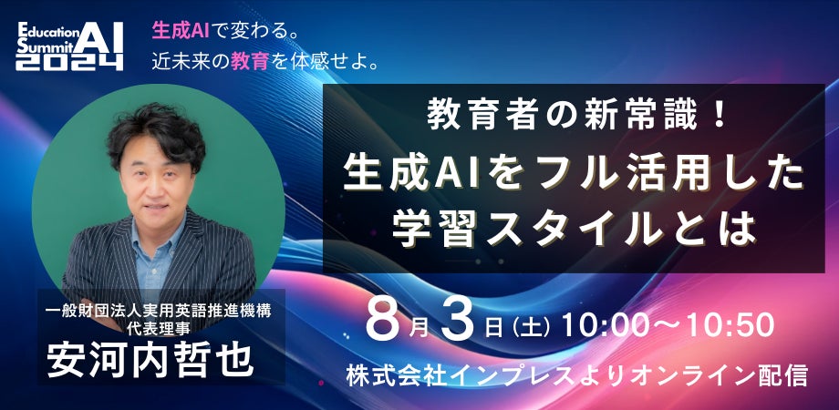一般社団法人教育AI活用協会(代表理事・佐藤雄太)は「教育AIサミット2024」にて、安河内哲也氏による「教育者の新常識!生成AIをフル活用した学習スタイルとは」を開催いたします。