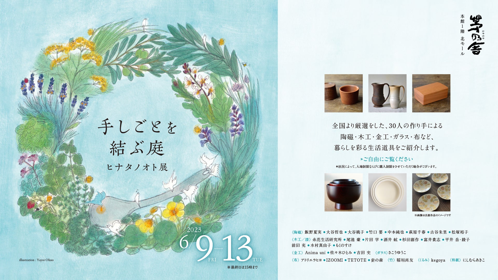 全国より厳選した、30人の作り手による生活道具展『~手しごとを結ぶ庭~ヒナタノオト展』を関西初開催~2023年6月9日(金)から13日(火)の5日間、茅乃舎 西宮ガーデンズ店にて~