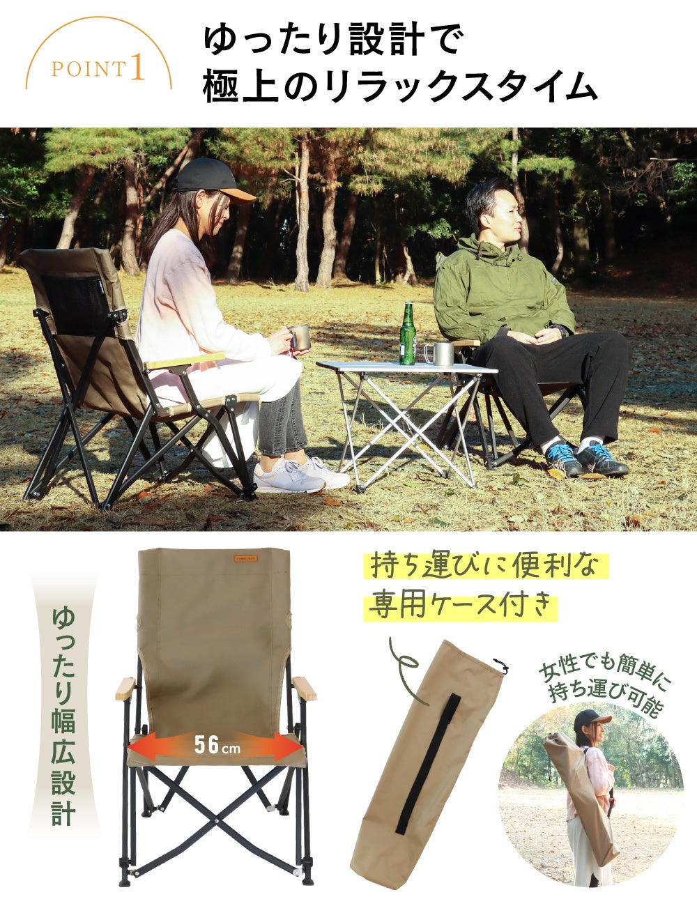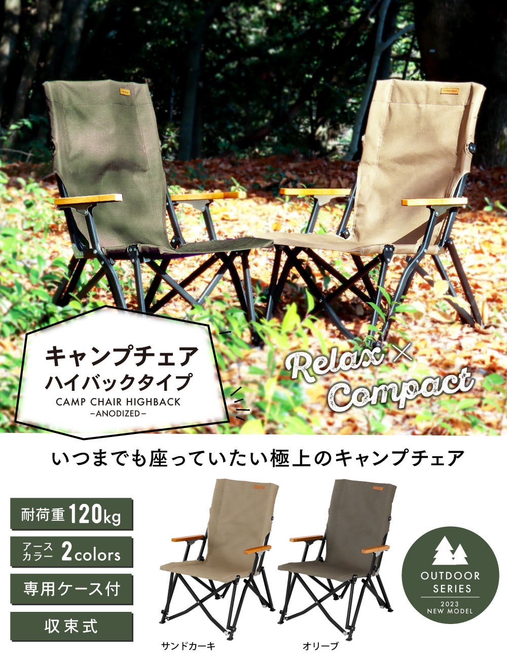 背もたれが高いハイバックタイプのアウトドアチェアでキャンプでのんびりと過ごしたいときに大活躍です。 ハイバックの椅子があれば、背もたれに体を預けて、昼寝や星空観賞ができたりアウトドアの楽しみの幅が広がります。