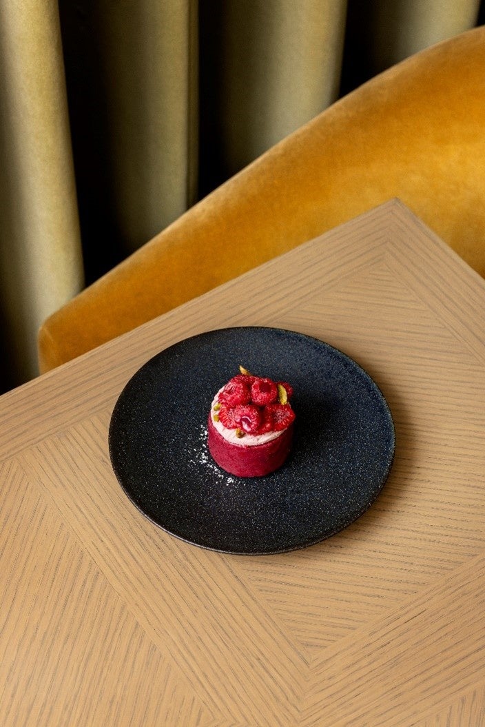しっとりとした口当たりと繊細な味わいのケーキで、鮮やかでポップな色と味も楽しめます。ピスタチオのケーキをラズベリーチョコレートでコーティングし、ラズベリークリームと新鮮なラズベリーをトッピングしました。