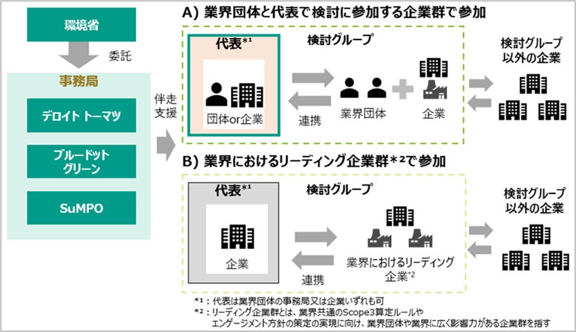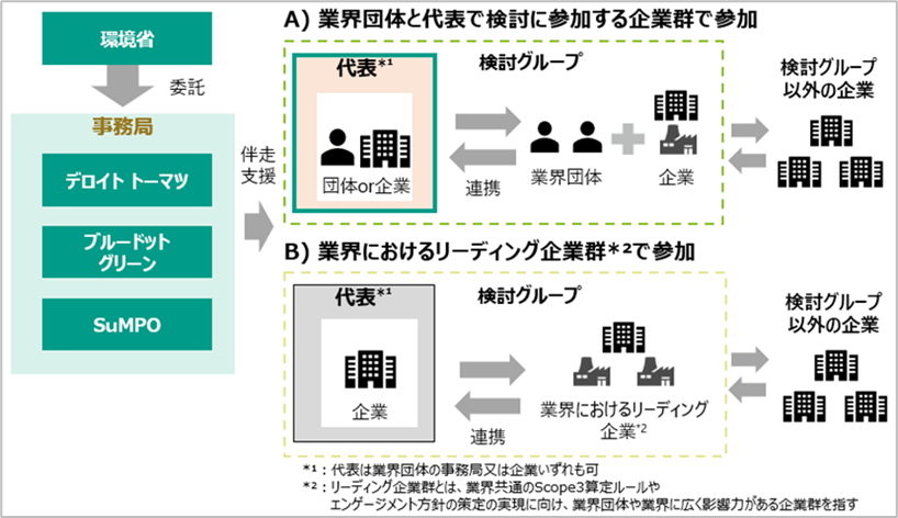 こうした背景から、一般社団法人サステナブル経営推進機構(以下、「SuMPO(さんぽ)」)、デロイト トーマツ グループのデロイト トーマツ コンサルティング合同会社(以下、「デロイト トーマツ」)、株式会社エスプールブルードットグリーン(以下、「ブルードットグリーン」)は、業界内でのデータ連携の促進や後発企業の支援を目的とし、業界共通のScope3算定ルールやエンゲージメント方針のガイドライン策定に向けた支援を行うためのモデル事業を実施いたします。