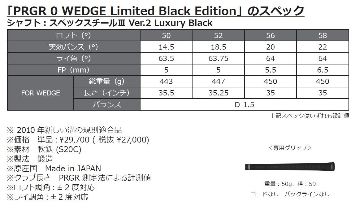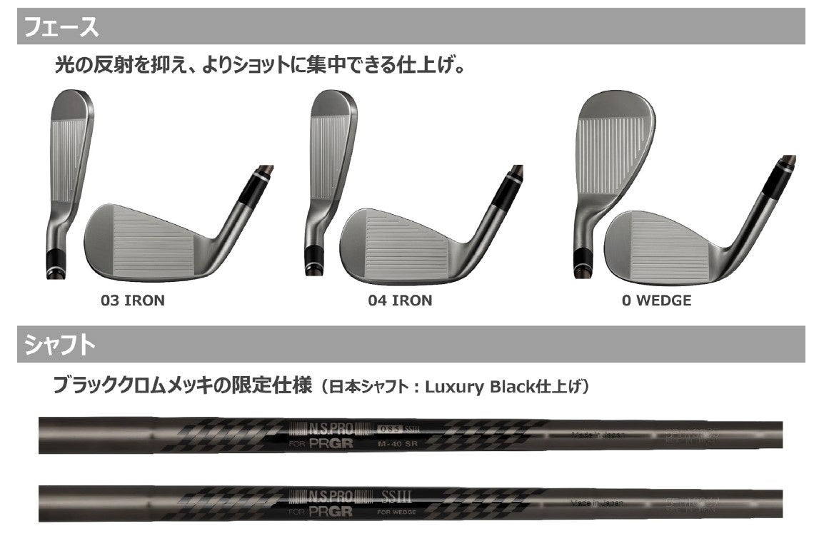(株)プロギアは、構えやすさ、打感、飛距離性能、コントロール性、やさしさといったアイアンに求められる性能を追求した「PRGR IRONs(プロギア・アイアン)」から、レギュラーモデルとは異なるブラッククロムメッキ仕上げを採用した特別仕様の「PRGR 03 IRON Limited Black Edition(ゼロサン・アイアン・リミテッド・ブラック・エディション)」と「PRGR 04 IRON(ゼロヨン・アイアン)Limited Black Edition」、「PRGR 0 WEDGE(ゼロ・ウェッジ)Limited Black Edition」を11月14日から数量限定で発売します。