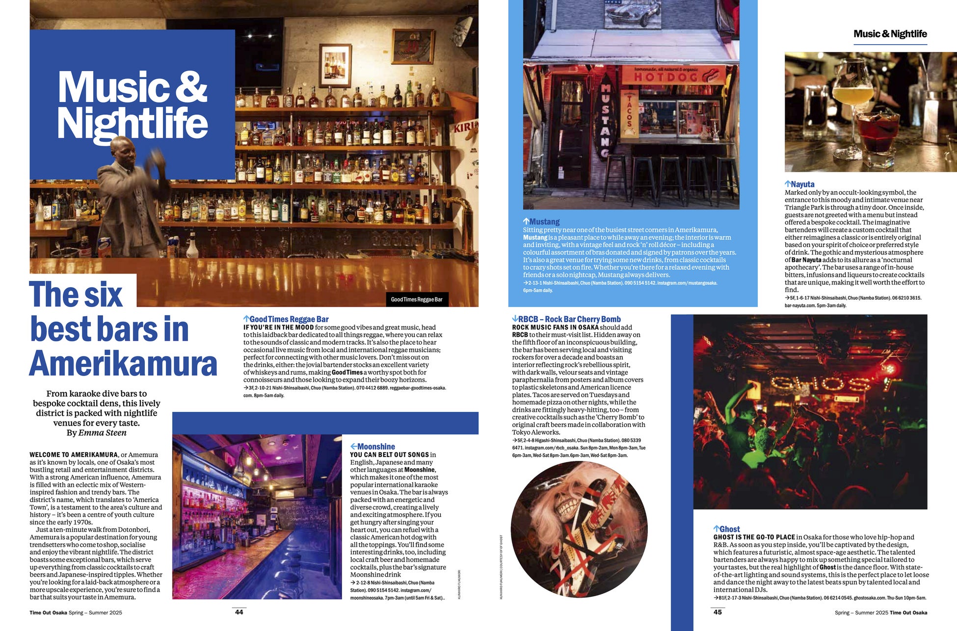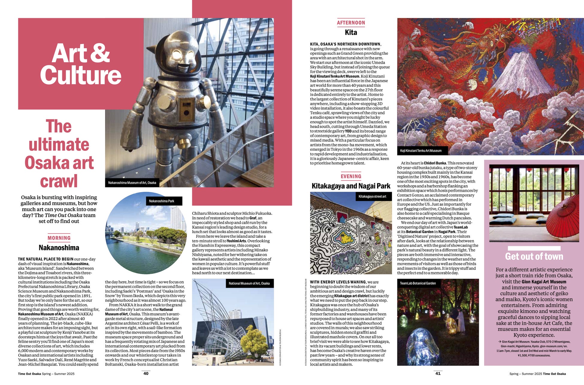 そのほか、全52ページのマガジンでは、アート好きのための美術館・ギャラリー巡りを紹介しています。世界クラスの美術館が並ぶ中之島から、創造性あふれる街・北加賀屋まで、1日でアートを満喫するルートを掲載しました。また、ナイトライフのセクションでは、アメリカ村でクラシックなカクテルやクラフトビールを楽しむためのガイドを紹介しています。カラオケのできるバーから、こだわりのカクテルが味わえる隠れ家バーまで、多彩なナイトライフ提案をお楽しみください。
