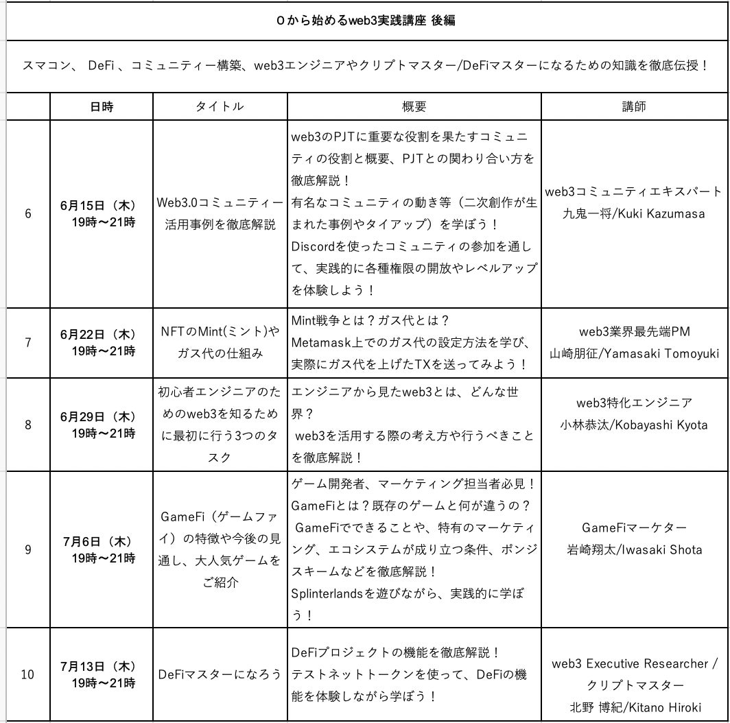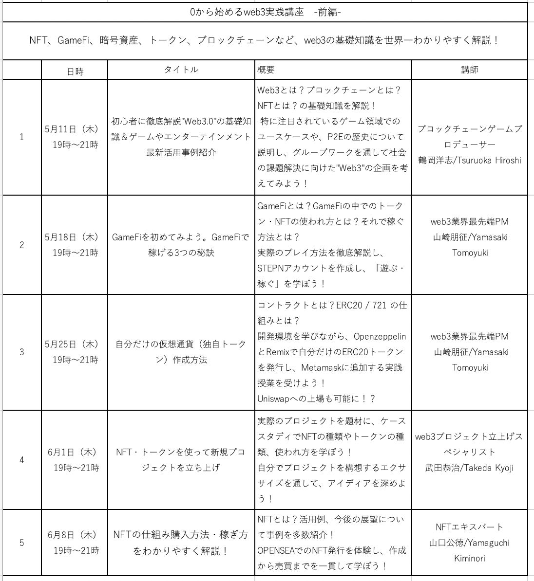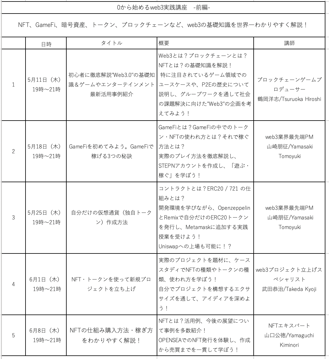 web3業界屈指の講師陣が、web3の基礎から最先端トレンド、多様なアプリケーションまでを、分かりやすく解説!座学に加えて、グループワークやOPENSEAでのNFT発行体験などの実践も交えながら、web3を0から学べる実践講座を全10回でお届けします。