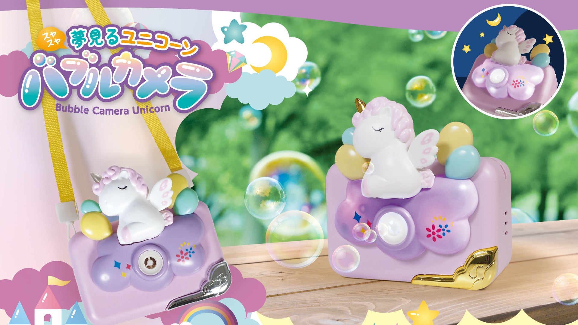 「かわちぃ♡カメラではい、チーズ!」と思いきや、出てくるのは「シャボン玉⁉」4月発売のユニコーン&サメの「バブルカメラ」でメロかわしゃぼん空間を演出