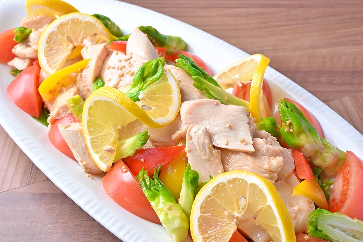 柔らかな蒸し鶏と色とりどりの春野菜を和えた、見た目も華やかな一品。レモンを用いることで、爽快感のある味わいに仕上げています。