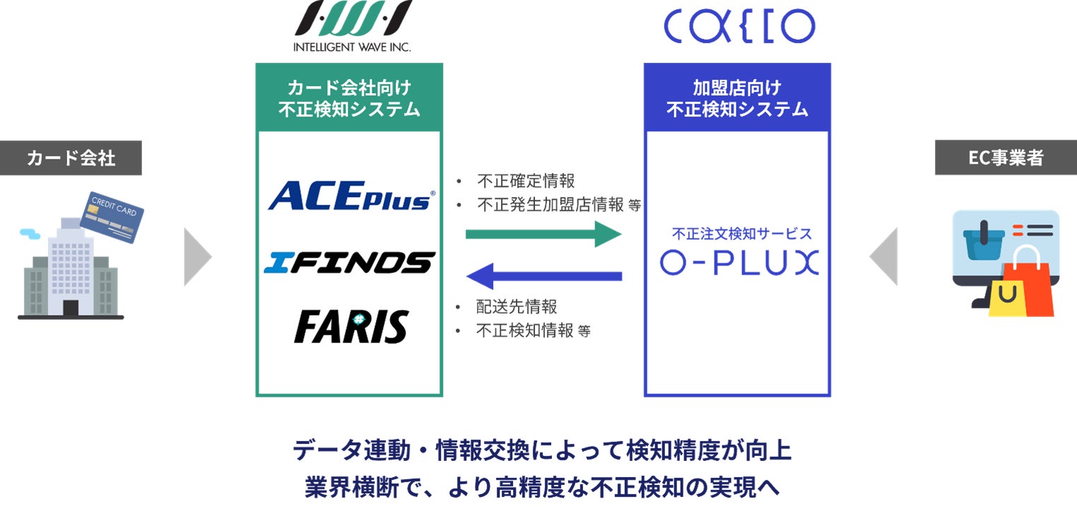 加盟店(ECサイト)側に位置する「O-PLUX」が保有する情報(不正配送先情報、注文情報等)を、IWIが提供するカード会社向け不正検知サービス「ACEPlus」および「IFINDS」へ連携し、カード会社における不正対策への活用を検討します。