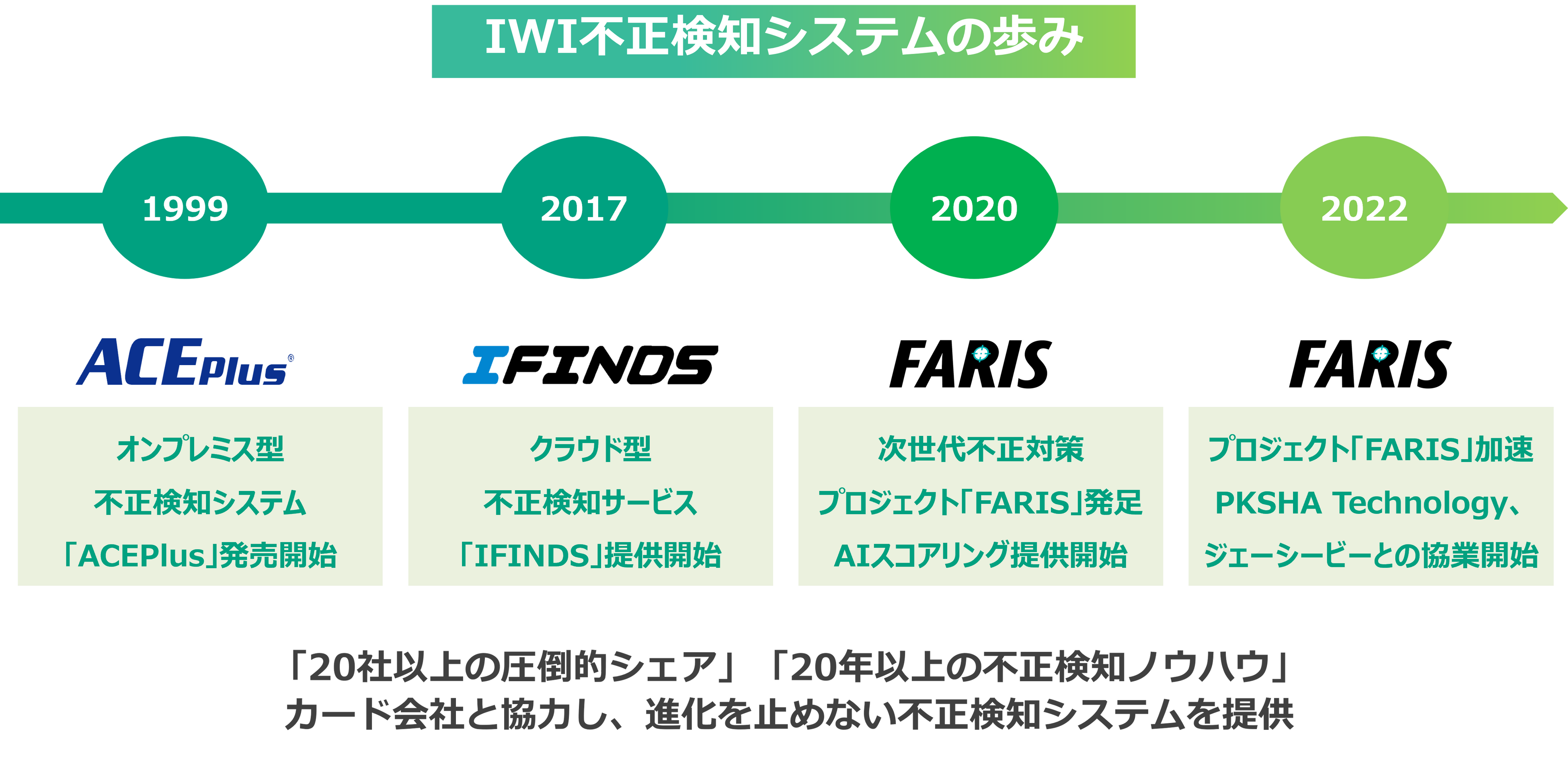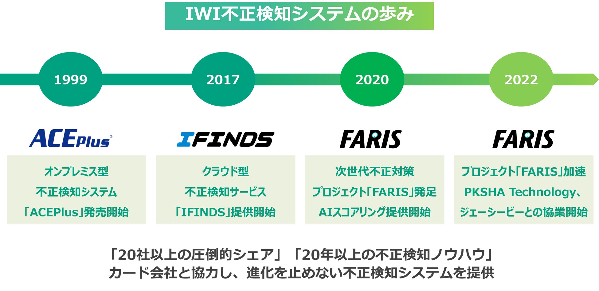 IWIは、1984年の創業以来、カード会社や銀行向けに24時間365日止まらない決済システムを提供してきました。そのノウハウや知見を活かし1999年に当社不正検知システムのACEPlusを開発しました。2017年にはクラウド型の不正検知システムとしてIFINDSを開発および展開。大手カード会社をはじめ20社以上の導入実績があります。