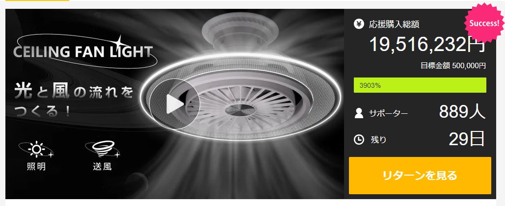 快挙!クラファン開始11日で『1000台』突破!空気の逆循環機能も備え、次世代のシーリングファンライト「LumaFlow」