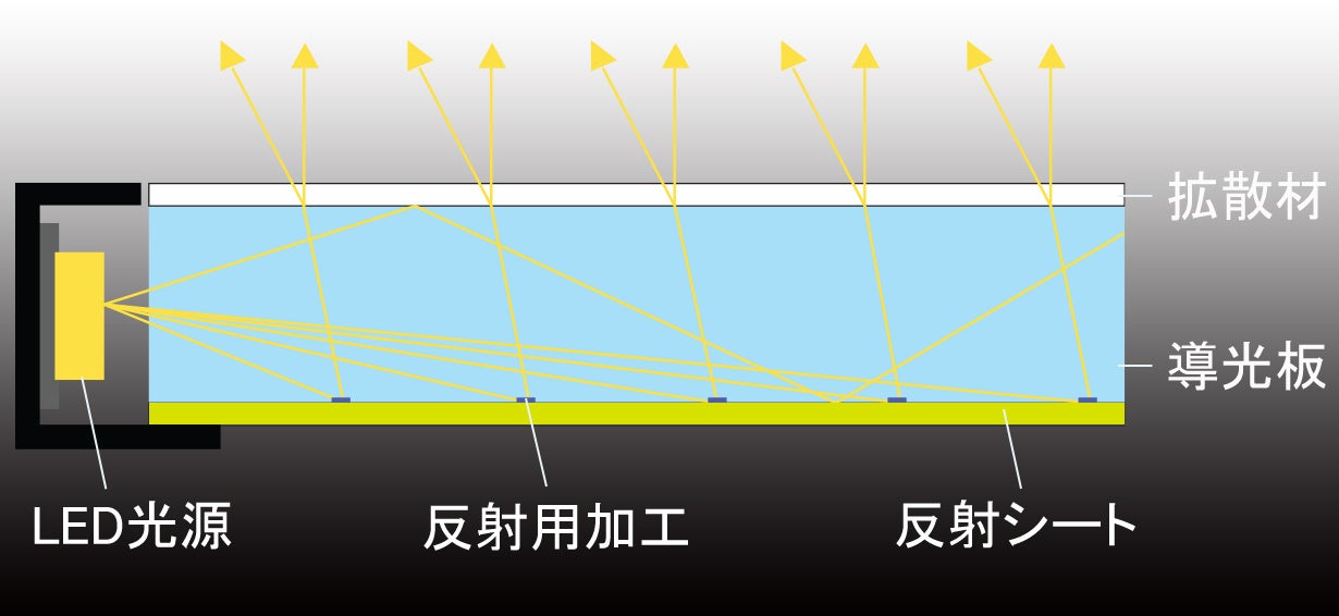 通常の照明とは異なり、LumaFlowはアクリル導光板を採用しています。特殊な加工を施したこの板は、光を横から入れることで光を拡散させ、板全体が明るく発光します。