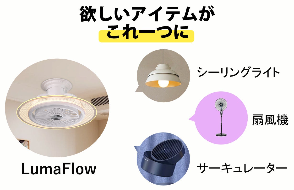 LumaFlowは、「照明」「送風」「空気循環」といった便利な機能を同時に備えており、1台で3つの機器の機能を果たすことができます。