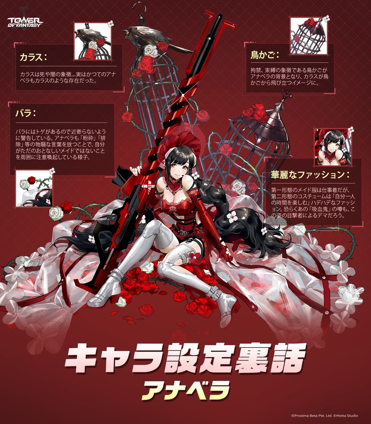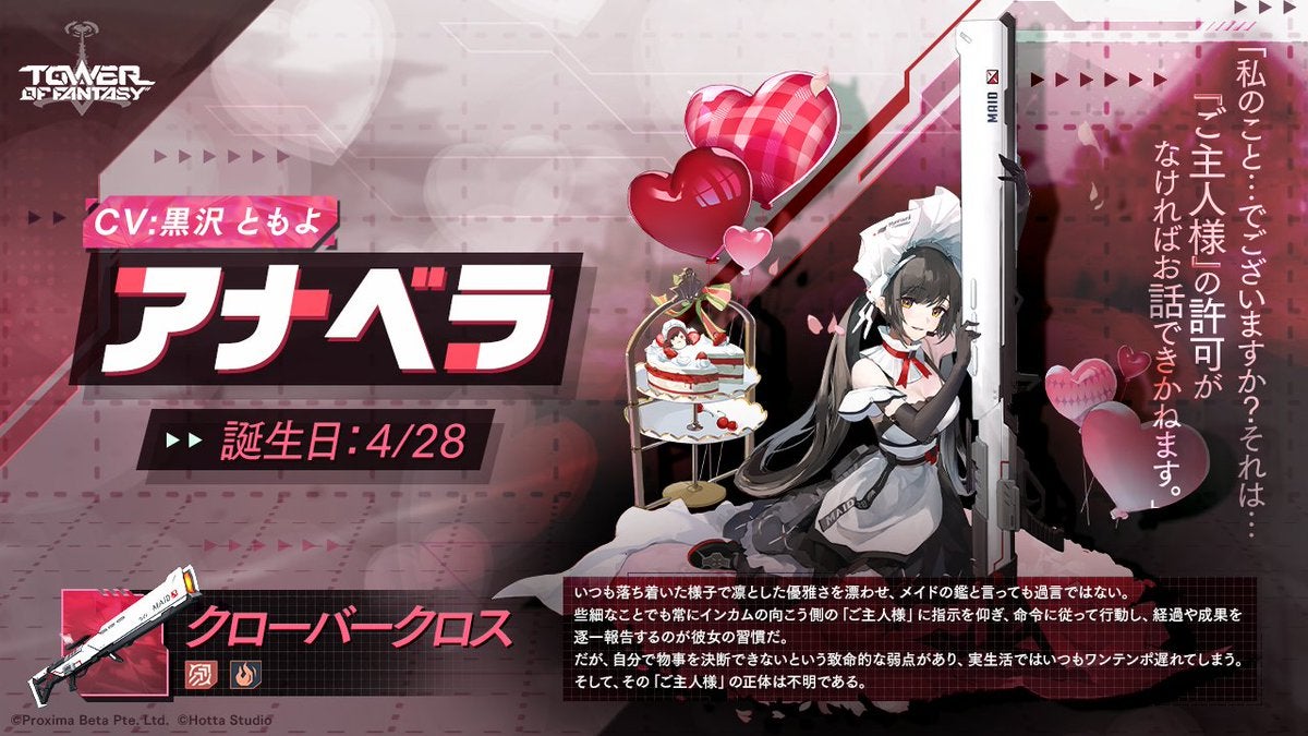 Level Infiniteは、PC・モバイル向けオープンワールドRPG『Tower of Fantasy(幻塔)』において、本日1月12日(木)より新キャラクター『アナベラ』とSSR武器「クローバークロス」を実装することをお知らせします。吸血鬼メイドとして知られる「ご主人様」に尽くす謎の多い彼女、ぜひ彼女の秘密を探索しましょう!
