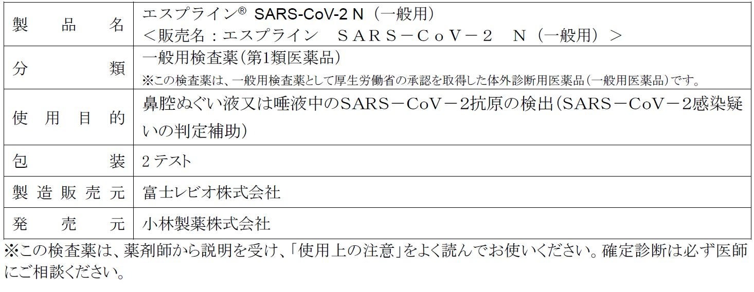 小林製薬株式会社(本社:大阪市、社長:小林章浩、以下「当社」)は、新型コロナウイルス(SARS-CoV-2)抗原検査キット「エスプライン® SARS-CoV-2 N(一般用)」(以下「当キット」、製造販売元:富士レビオ株式会社)が、10月17日付で厚生労働省より、一般用検査薬(第1類医薬品)として製造販売承認されましたことをお知らせいたします。