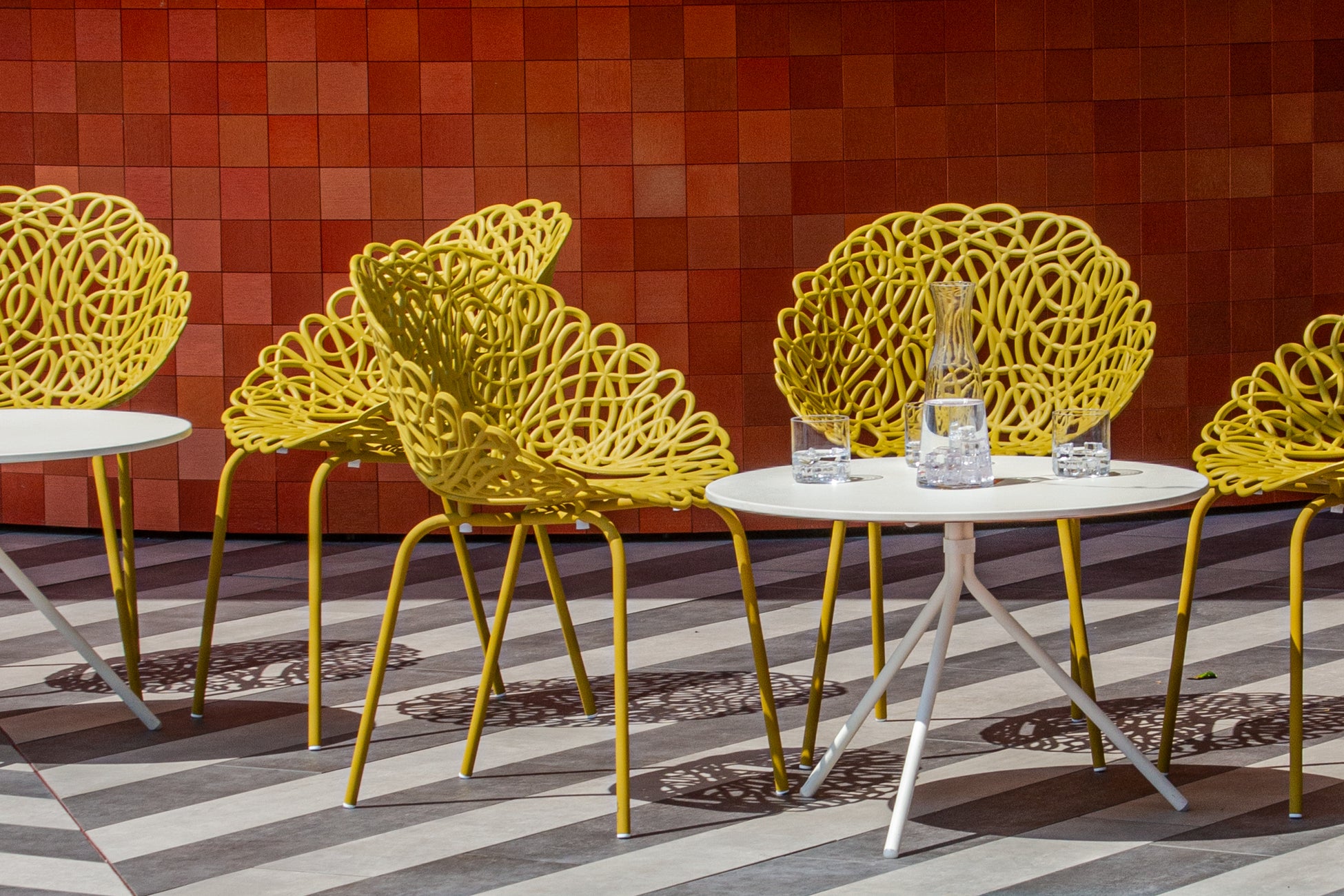 世界的に有名なブラジルのデザインユニット「スタジオカンパーナ」とコラボレーションしたチェア。ポルトガル語のスラングで「イケてる」「かっこいい」を意味するこの名前の通り、ねじれたような形と絡み合う曲線は、彼らのデザイン言語そのものです。屋外使用にも対応し、テラスやカフェ空間にも映えるデザイン。スタッキング可能で収納性も高く、機能性と芸術性も兼ね備えています。