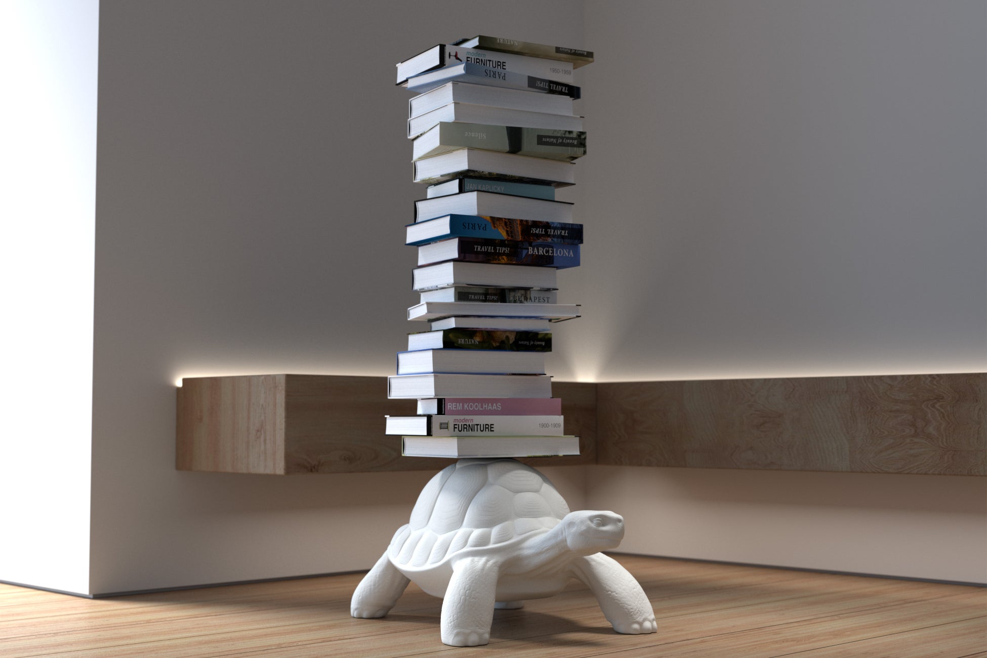古来より知識を運ぶシンボルとして、亀が甲羅に本を背負うというユニークな発想から生まれた、アートピースのような本棚です。リサイクル可能なポリエチレン製のベースと頑丈なスチール製シェルフを組み合わせ、安定した収納力と耐久性を実現。置き場所を選ばない自立型構造で、リビングや書斎物語性と遊び心を添えてくれます。