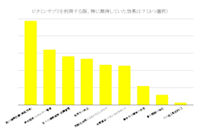 ビタミンサプリを継続的に利用する際、効果として「肌の健康改善(美肌効果)」を特に期待していたと7割以上もの人が回答。続いて「疲労回復・エネルギー増進」「日々の健康維持・体調管理」「免疫力の向上」が期待されており、美容・健康面での効果を求めてビタミンサプリを摂取する人が圧倒的に多いことがわかりました。